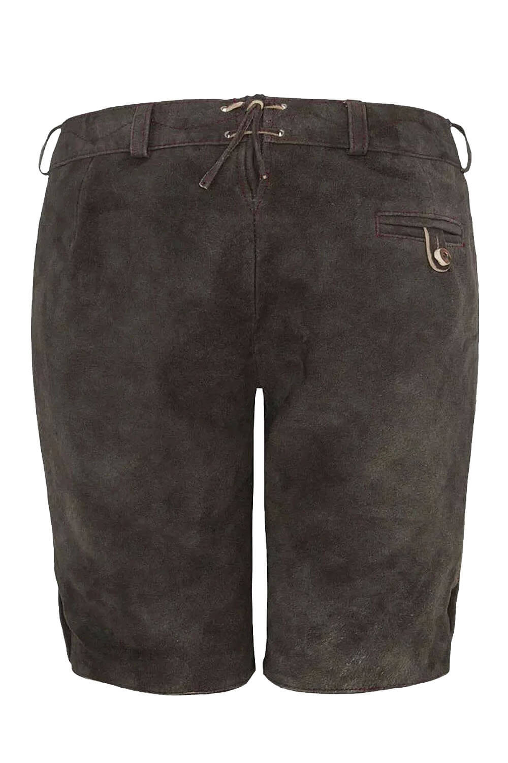 What sets this stylish short lederhosen apart is its beautiful embroidery. The front panel showcases intricate vine-like floral patterns in burgundy and beige that stand out against the deep brown goat suede leather. These delicate details add a feminine flair to the rugged texture, blending traditional Bavarian design with a modern twist. The lace-up back enhances the flattering fit while adding rustic charm, making it perfect for any woman seeking an authentic yet stylish Oktoberfest outfit.