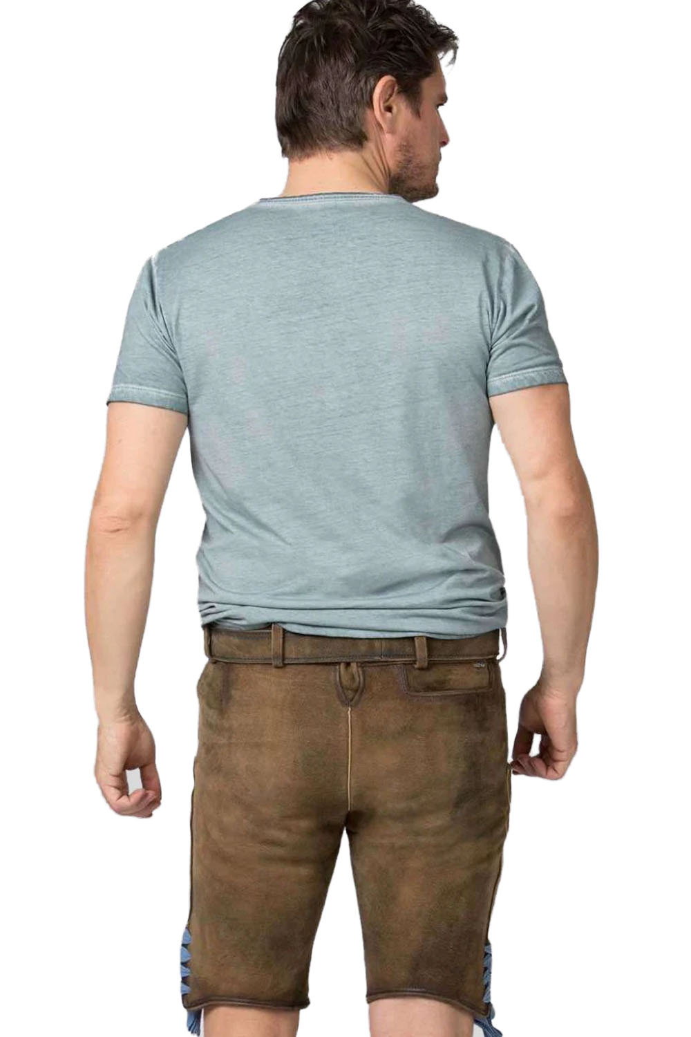 Designed with precision and pride, these Bavarian leather shorts showcase traditional floral embroidery in elegant shades of blue and earthy hues, decorating the front and side panels with striking detail. Adjustable lace-up sides allow for a personalized fit, merging heritage craftsmanship with everyday comfort. A solid leather belt with a detailed antique buckle ties the look together, making these Lederhosen a bold centerpiece for any traditional outfit.