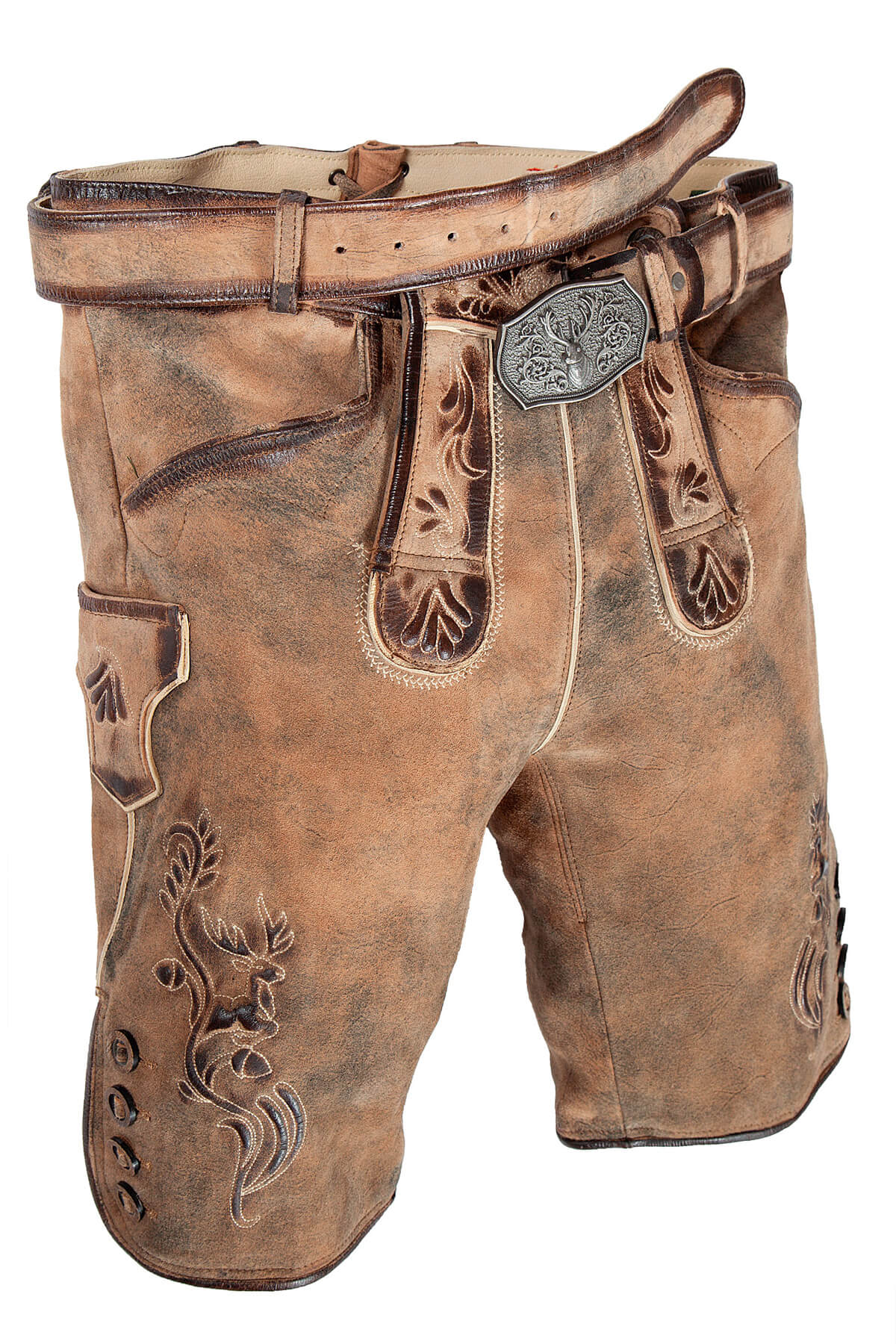 Detailed with elegant Bavarian embroidery, the shorts feature classic vine motifs and a majestic stag symbol—a powerful representation of strength and alpine culture. The embroidery is subtly stitched in earthy brown tones, blending seamlessly into the suede to create a refined yet rugged aesthetic. A sturdy leather belt with a metal stag-embossed buckle adds a finishing touch, tying together the traditional craftsmanship with a modern edge.