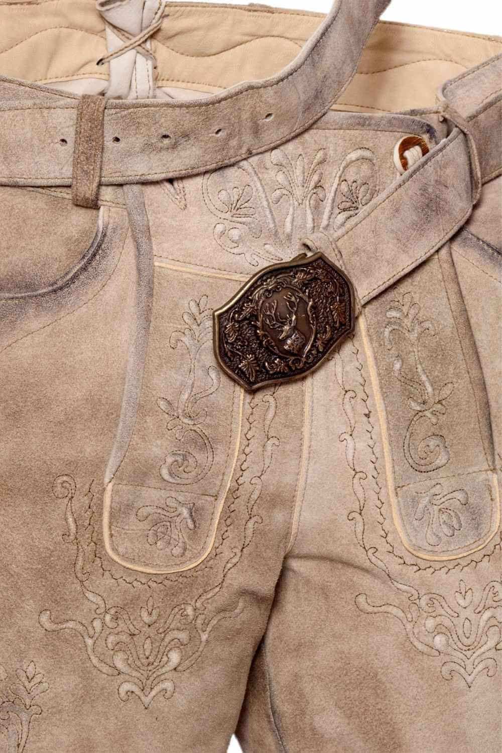 The LaBrassBanda Lederhosen by Alpen Lederhosen blends bold design with Bavarian heritage. Made from real wild buck leather in a soft grayish-light brown tone, these Bavarian short pants feature olive green oak leaf embroidery for a nature-inspired and rugged look, perfect for menβs Oktoberfest outfits.