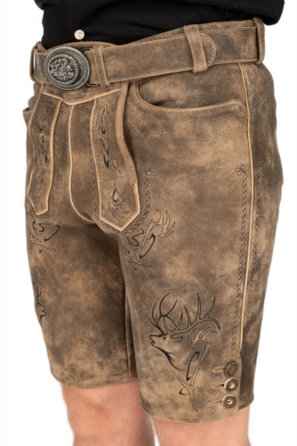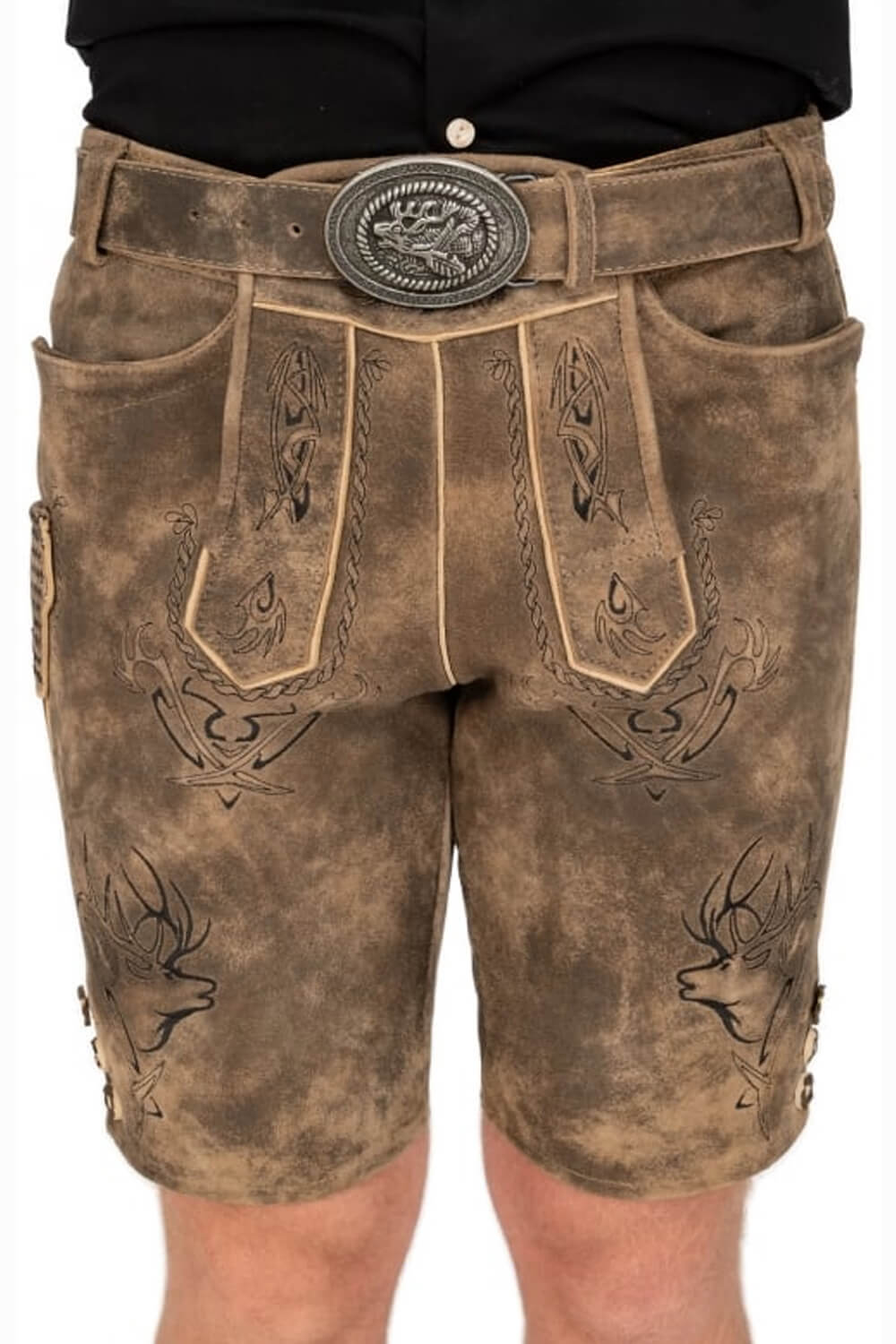 Men’s Fredo Lederhosen Shorts combine timeless Bavarian craftsmanship with everyday comfort in one rugged, standout piece. Made from premium goat suede leather, these handcrafted shorts feature deep brown tones contrasted with light brown embroidery, showcasing detailed Alpine motifs that reflect true German heritage. The rustic finish and engraved antique-style belt add a touch of old-world charm, making them a striking choice for Oktoberfest or any cultural celebration.