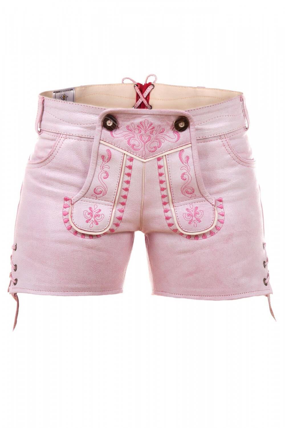 With these Sexy Pink Princess Shorts Lederhosen, you can embrace your inner Pink Princess! Made from supple pink leather, these stunning pieces include elaborate stitching that is sure to catch eyes. Gentle rosette ribbons accent the legs, offering further sizing flexibility and a dash of quirky appeal. Adjustable leather straps at the back provide the ideal fit and comfort for the duration of your celebrations. An essential item for any style-conscious person hoping to celebrate Oktoberfest with flair and make a statement!